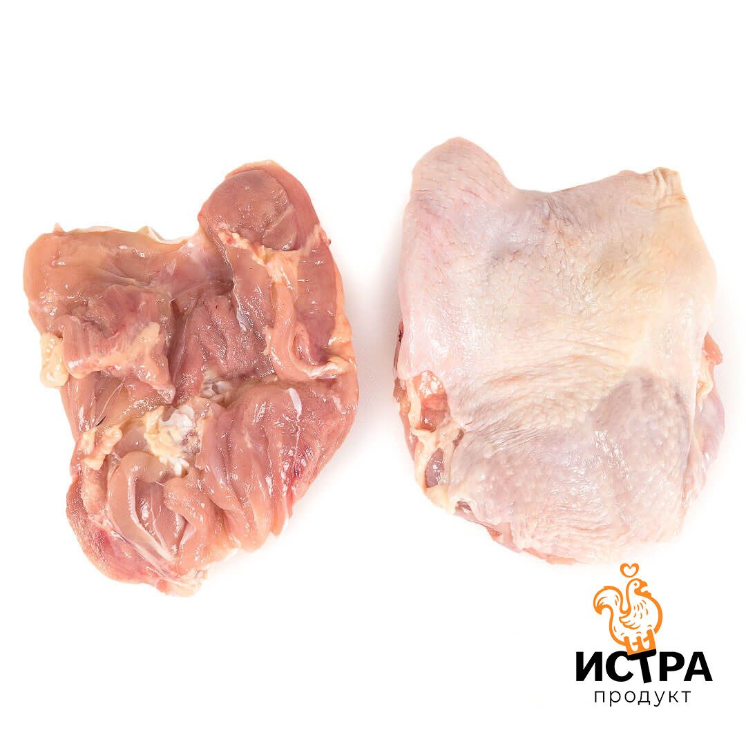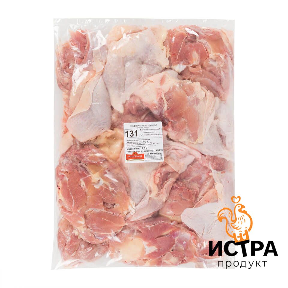Бескостная мякоть из мышц голени и бедра с неповрежденной кожей расфасована в упаковки по 0,5 кг, 2.5 кг и 12 кг.